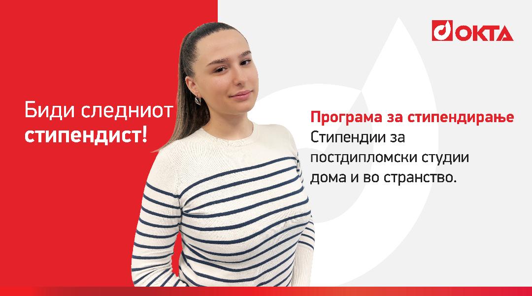 Скопје, 30.03.2026 - Компанијата осма година по ред објавува повик за доделување стипендии за постдипломски студии за академската 2026/2027 година. Во овој нов повик, зголемен е бројот на академските области за аплицирање, а дополнет е и со  можноста за делумно покривање на трошоците за живот во согласност со однапред утврдени критериуми. ОКТА АД – Скопје продолжува со својата долгорочна посветеност за поддршка на образованието и развојот на млади професионалци.